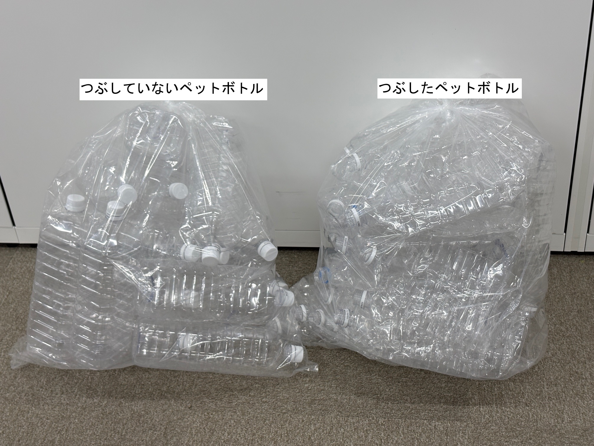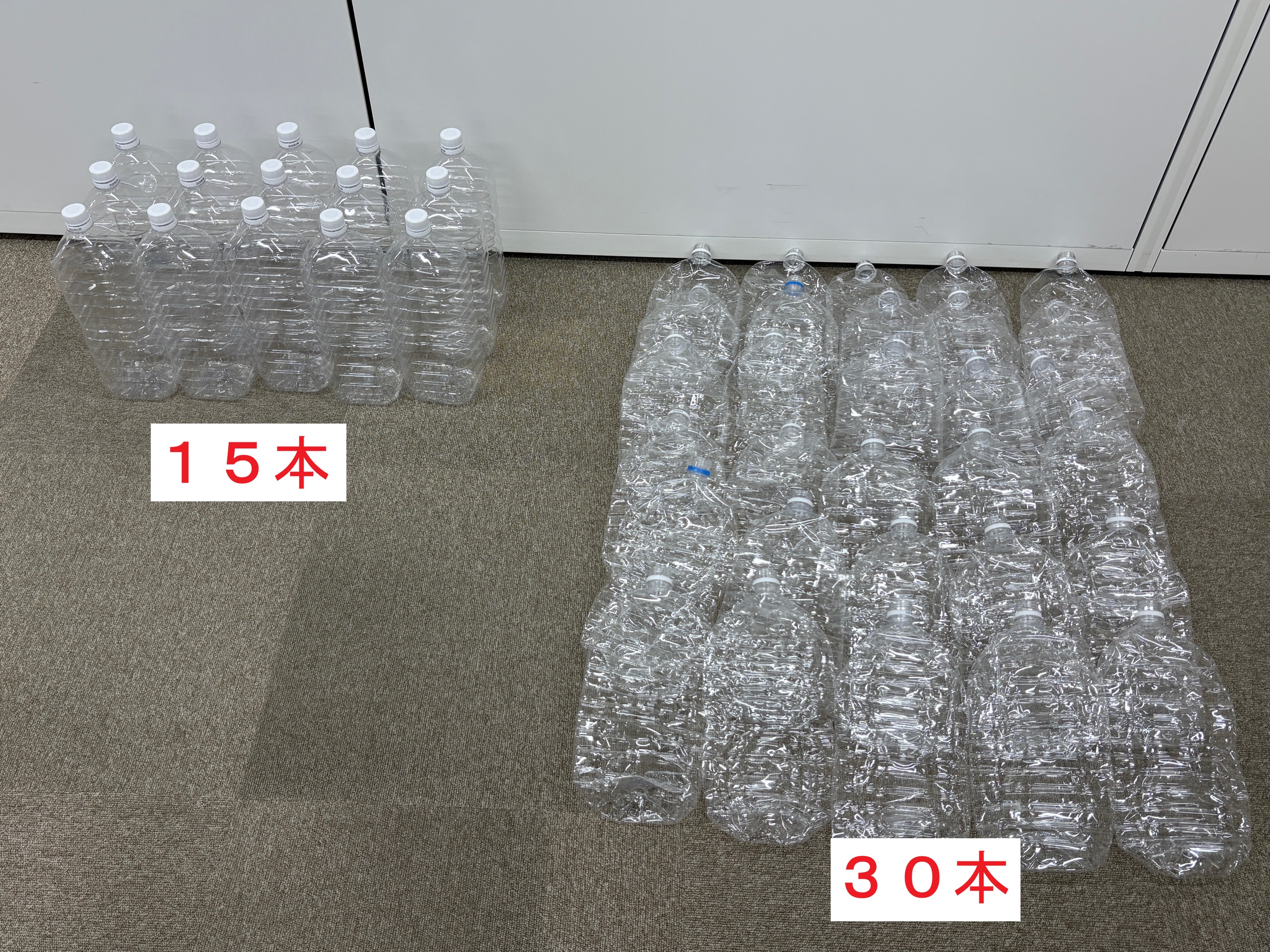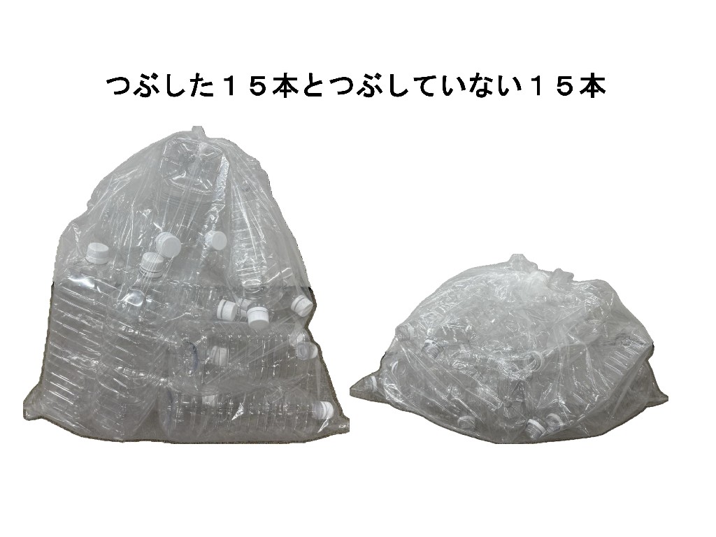 結果は・・・つぶしていないペットボトルは15本、つぶしたペットボトルは30本でした!入れ方によって差が出てくるかもしれませんが、約2倍入りました。